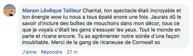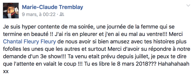 Voici un commentaire de la directrice d’un organisme qui m’engageait pour une 3e fois à un de leur événements..