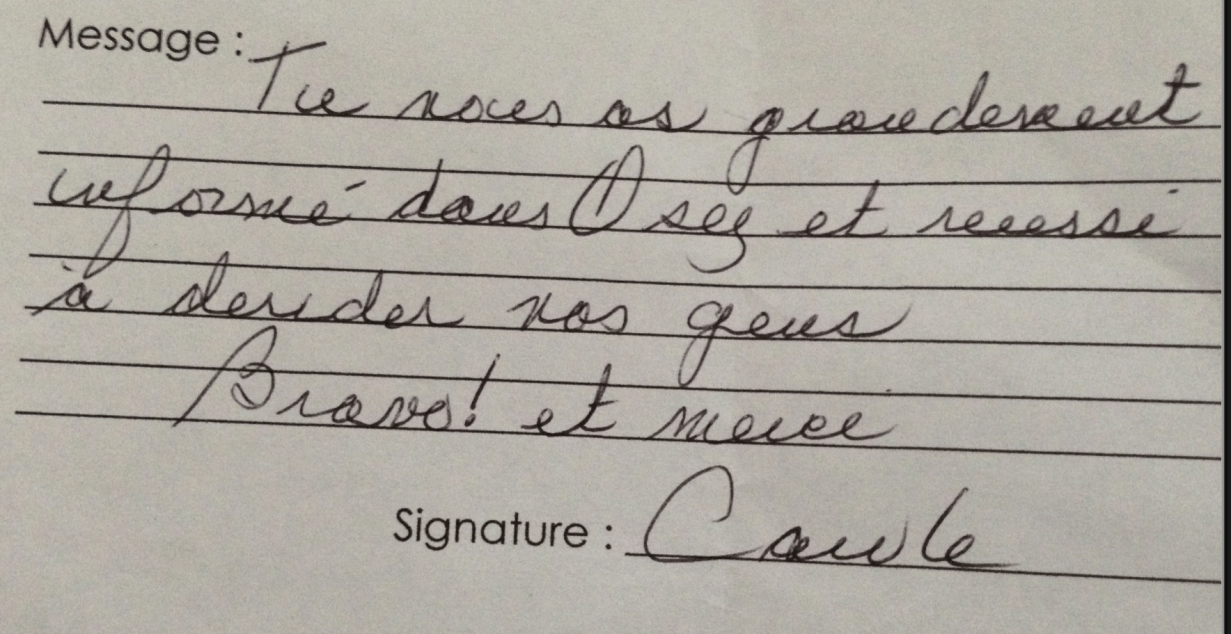 Un petit mot gentil suite à mes prestations avec L’AREQ Rivière-du-Loup