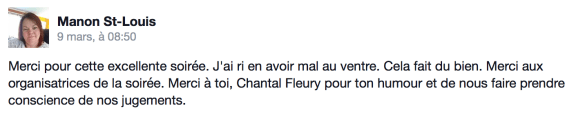 « Merci Chantal!!! J’ai passé une très belle soirée 🙂 j’ai du me réhydrater en revenant à la maison tellement j’ai pleuré de rire 🙂 xx » (Marie-Claude Tremblay, janvier 2014)