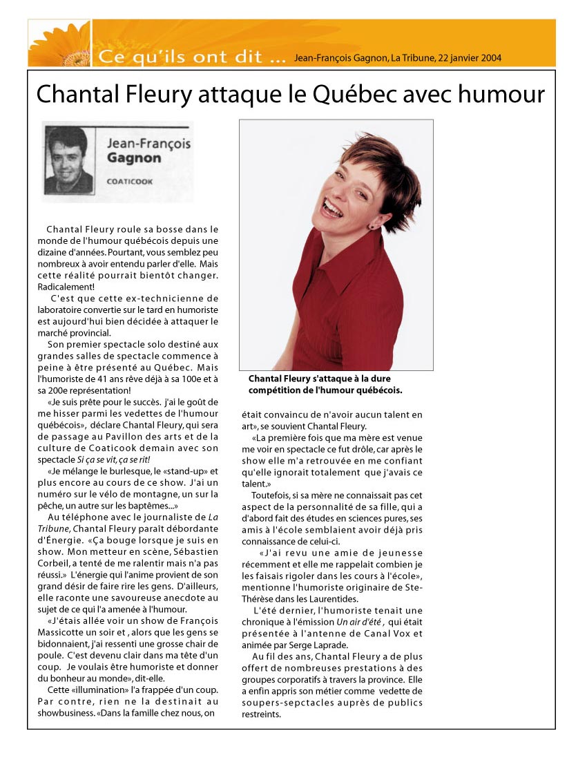 « Avec Chantal Fleury on a pas affaire à une débutante mais bien à une grande humoriste…Un vent de fraîcheur et d’oestrogènes se lève puisque Chantal Fleury arrive en ville! Elle sait affiner ses textes pour sortir de l’anecdotique clos et finalement rire des penchants de monsieur et madame tout le monde. Son numéro sur le vélo et la pêche, initiés par son copain, sont athlète, son hilarants…Chantal Fleury joue avec la scène, l’espace scénique comme la salle en tant que tel, et elle enchâine ses numéros avec rapidité…Verbomotrice à la Louis-José Houde, elle rit de ses bons gags comme Yvon Deschamps et réponds aux élans de la foule mieux que les Denis Drolet! On passe un bon moment avec Chantal Fleury. Et l’aisance avec laquelle elle interagit avec le public fera certainement l’envie de tous les finissants de l’École de l’humour… À surveiller ! » Kim Saint-Pierre, CHOQ-FM, octobre 2004