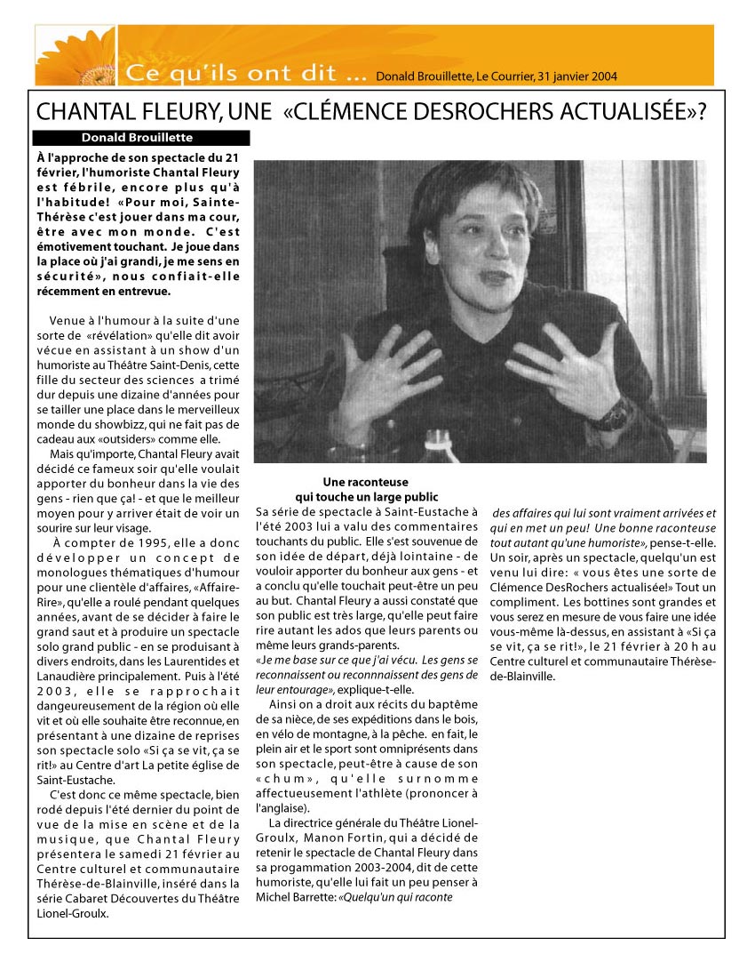 « L’assitance a ri de bon coeur… Chantal Fleury est une personne naturellement sympathique que sans même avoir dit un mot on l’aime déjà… Les spectateurs sont ressortis enchantés de leur expérience. «Ça valait le coût d’aller voir ce spectacle, on s’est beaucoup amusé», s’exclamait spontanément une spectatrice à sa sortie. » Isabelle Vallière, L’information du Nord, août 2005