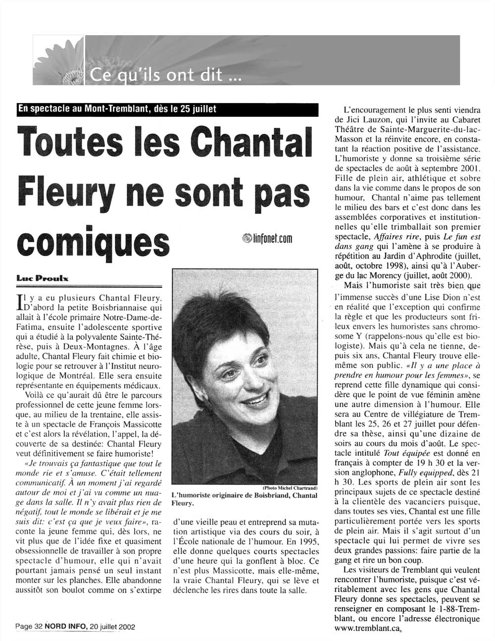 « Chantal Fleury : un humour renversant ! Chantal Fleury est une caricature vivante des gens qui nous entourent dans des situations de tous les jours. » Nancy Guénette, L’Écho de la Lièvre, juillet 2005